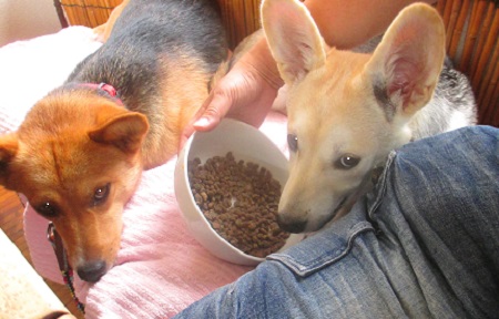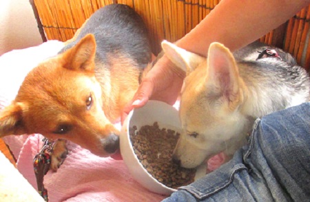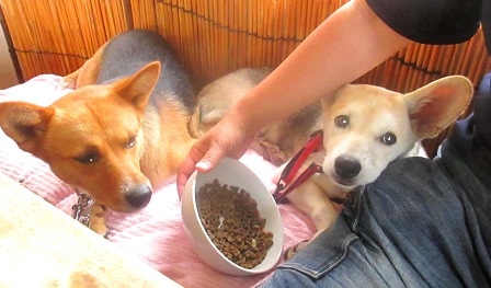 ムギねいちゃん(左)さっさとフードたいらげたのに アズ(右)はまだトロトロ、食べよるんかい アズはまだパピーでしゅけん |