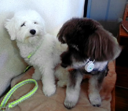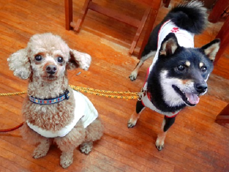 は、初めて来ました 左 ハズキちゃん 2才 右 ネネちゃん 4ヶ月のパピー モンジュリデビューって 何やろ? どうする、どうする |