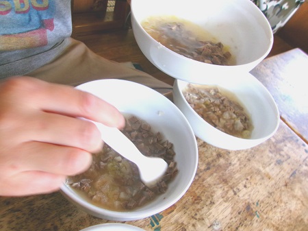 ふ~ふフンフン ママがちっちゃく切てくださった ハツやら豚耳 ご飯を入れたら完成 待て!!! |